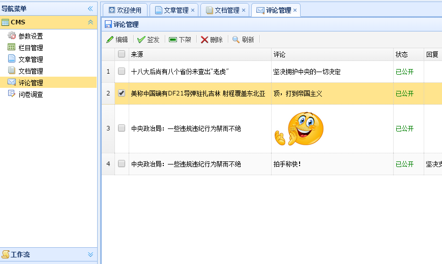 评论管理:支持草稿、下架、签发、回复功能,未发布的评论在前台将自动屏蔽。